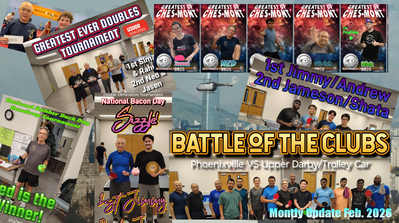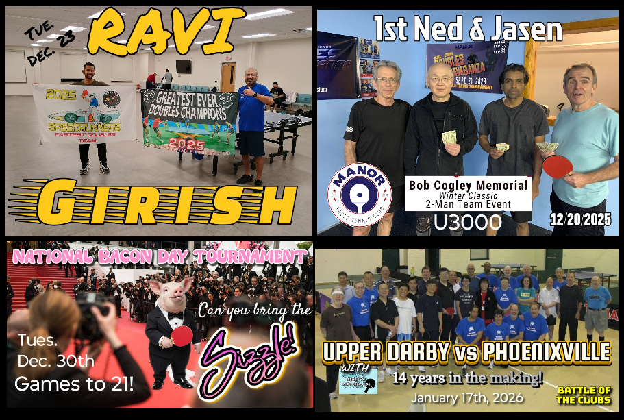 Playing at the Phoenixville Recreation Center since April 2022. Previously Phoenixville Table Tennis Club ran from 2009 to 2015 in Phoenixville and 2015-2020 as Rising Phoenix in KOP drawing players from Exton, Downingtown, Malvern, King of Prussia, Collegeville, Pottstown, and even Princeton, NJ. On any night we would have between 15 and 40 players. Our friendly atmosphere, regulated playing format, and fair treatment of all playing levels helped us to succeed.