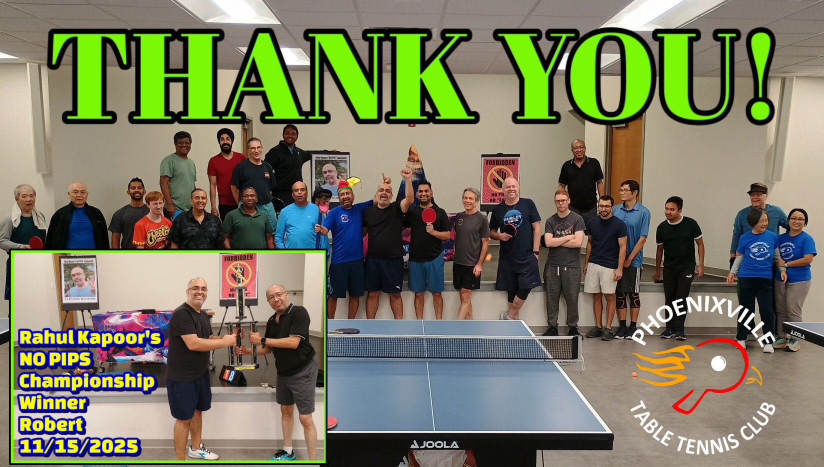 Playing at the Phoenixville Recreation Center since April 2022. Previously Phoenixville Table Tennis Club ran from 2009 to 2015 in Phoenixville and 2015-2020 as Rising Phoenix in KOP drawing players from Exton, Downingtown, Malvern, King of Prussia, Collegeville, Pottstown, and even Princeton, NJ.  On any night we would have between 15 and 40 players. Our friendly atmosphere, regulated playing format, and fair treatment of all playing levels helped us to succeed.